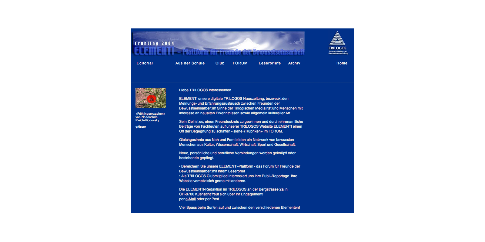 ELEMENTI, unsere digitale TRILOGOS Hauszeitung, bezweckt den Meinungs- und Erfahrungsaustausch zwischen Freunden der Bewusstseinsarbeit im Sinne der Trilogischen Medialität und Menschen mit Interesse an neualten Erkenntnissen sowie allgemein kultureller Art.