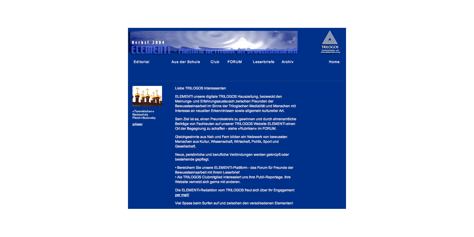 Sein Ziel ist es, einen Freundeskreis zu gewinnen und durch ehrenamtliche Beiträge von Fachleuten auf unserer TRILOGOS Website ELEMENTI einen Ort der Begegnung zu schaffen - siehe «Rubriken» im FORUM.