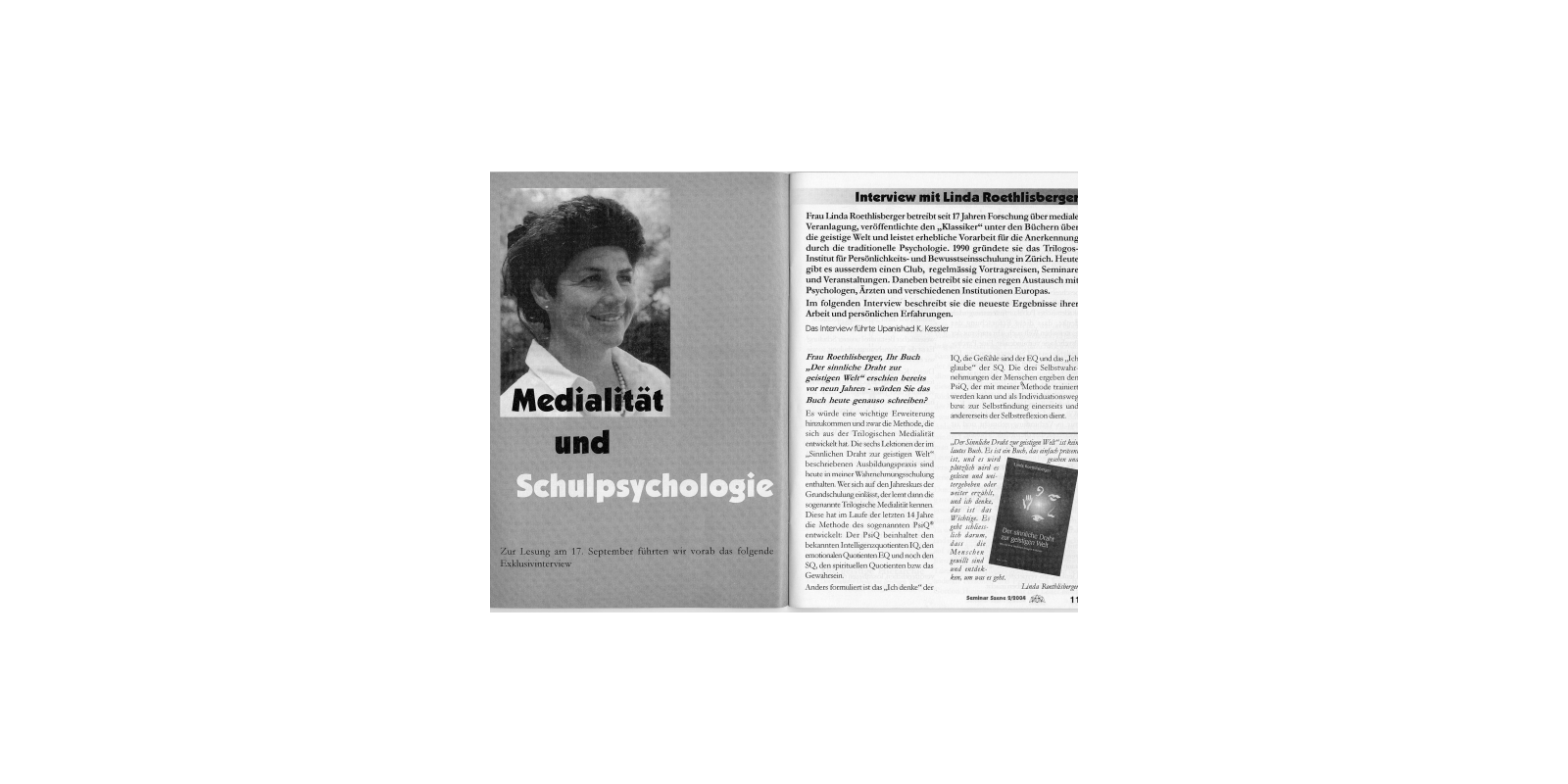 Frau Linda Roethlisberger betreibt seit 17 Jahren Forschung über mediale Veranlagung, veröffentlichte den "Klassiker" unter den Büchern über die geistige Welt und leistete erhebliche Vorarbeit und Anerkennung durch die traditionelle Psychologie. 1990 gründete sie das Trilogos-Institut für Persönlichkeits- und Bewusstseinsschulung in Zürich. Heute gib es ausserdem einen Club, regelmäßig Vortragsreisen, Seminare und Veranstaltungen. Daneben betreibt sie einen regen Austausch mit Psychologen, Ärzten und verschiedenen Institutionen Europas. Im folgenden Interview beschreibt sie die neuesten Ergebnisse ihrer Arbeit und persönlichen Erfahrungen.