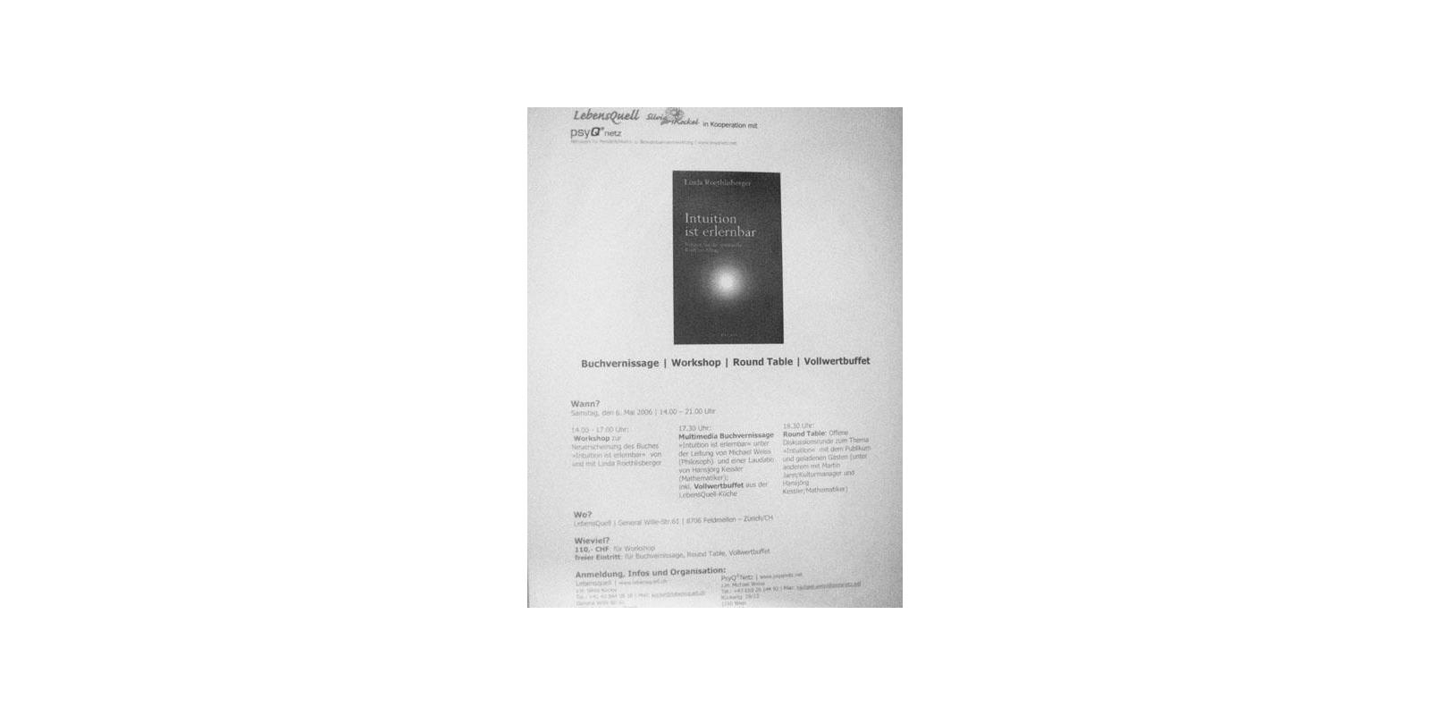 2006 war das Erscheinungsjahr des Arbeits-Buches ’Intuition ist erlernbar - nutzen Sie die spirituelle Kraft im Alltag’ (Hugendubel-Verlag) sowie der ’Trilogos-PsyQ®Methode’ (Peter Lang Verlag, Europäischer Verlag der Wissenschaften) - beide von Linda Roethlisberger. Zur Präsentation gab es eine Buchvernissage mit Dias und Lichtbildern.